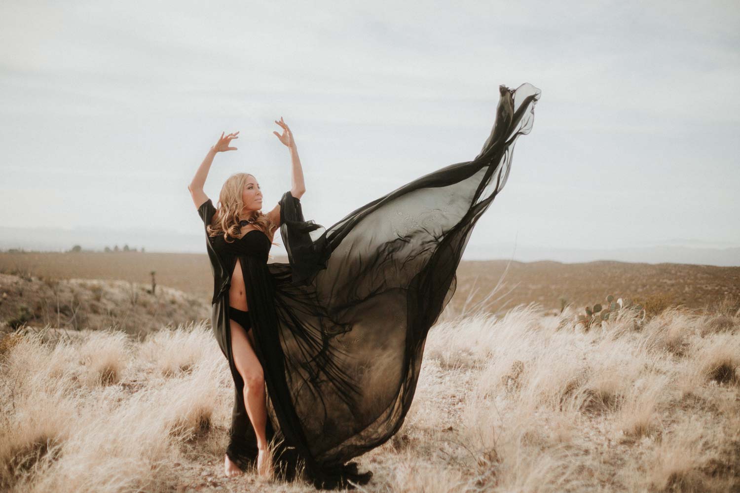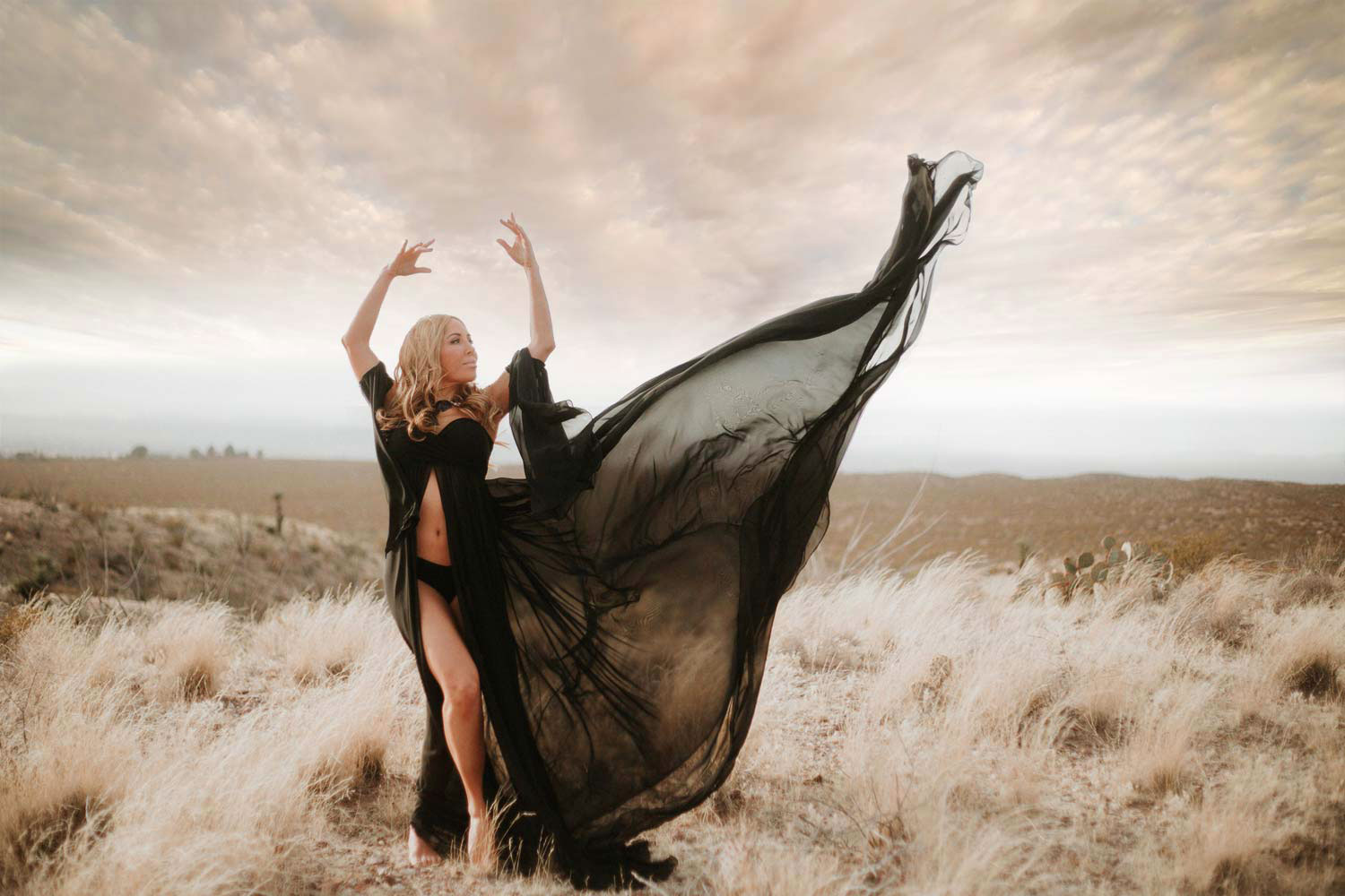 Digital Retouching: The client's original goal was a windswept Desert Goddess but the sky was overcast and uneventlful. We were able to remedy this by seamlessly inserting a more dramatic cloud formation that worked with the lighting of the subject and surrounding terrain.