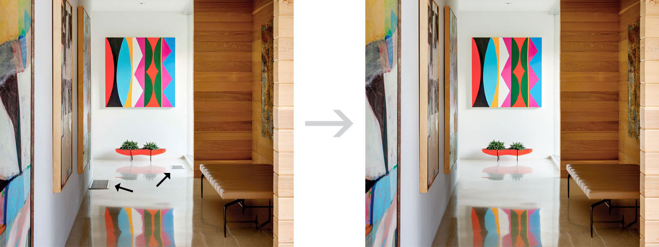 Editing out details: This hallway photograph was about to be published in a national design magazine. The client found the airconditioning vents on the floor distracting and asked us to remove them entirely.